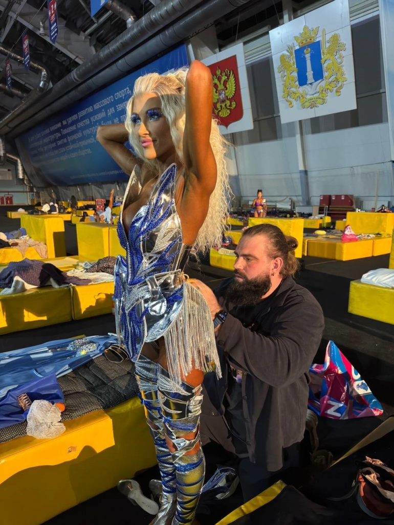 Помощники буквально «втискивают» участниц в сложные костюмы, ведь в номинации «Артистик-модель» любая незакрепленная деталь может стоить победы.