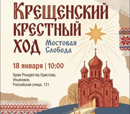 Председатель областной Ассоциации ТОС Владимир Сидоров сообщает, что, в воскресенье, 18 января, в Ульяновске состоится Крещенский крестный ход. Он будет проходить в Мостовой Слободе.