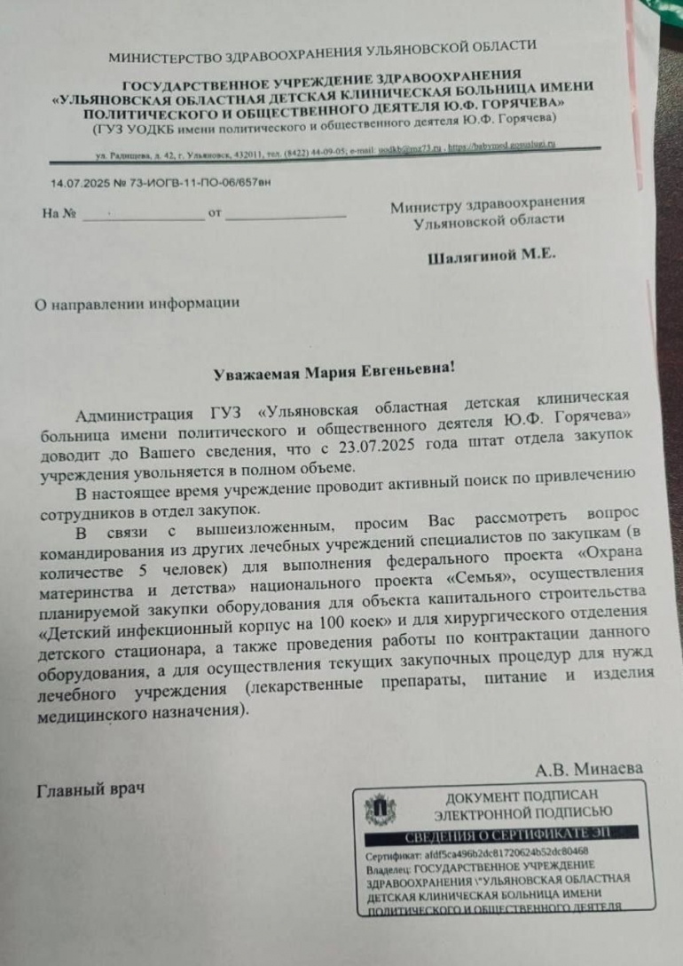 Вчера в публичном пространстве появилось письмо за подписью главного врача Областной детской клинической больницы Анны Минаевой, где она сообщает министру здравоохранения Марии Шалягиной, что с сегодняшнего дня пять человек, из которых состоит отдел закупок, увольняются. Поэтому они просят командировать к ним сотрудников из других больниц. Иначе работа встанет. Больница не сможет закупать оборудование, лекарства, медицинские изделия. Под угрозой срыва окажется реализация нацпроекта «Семья». Этим просто некому будет заниматься.