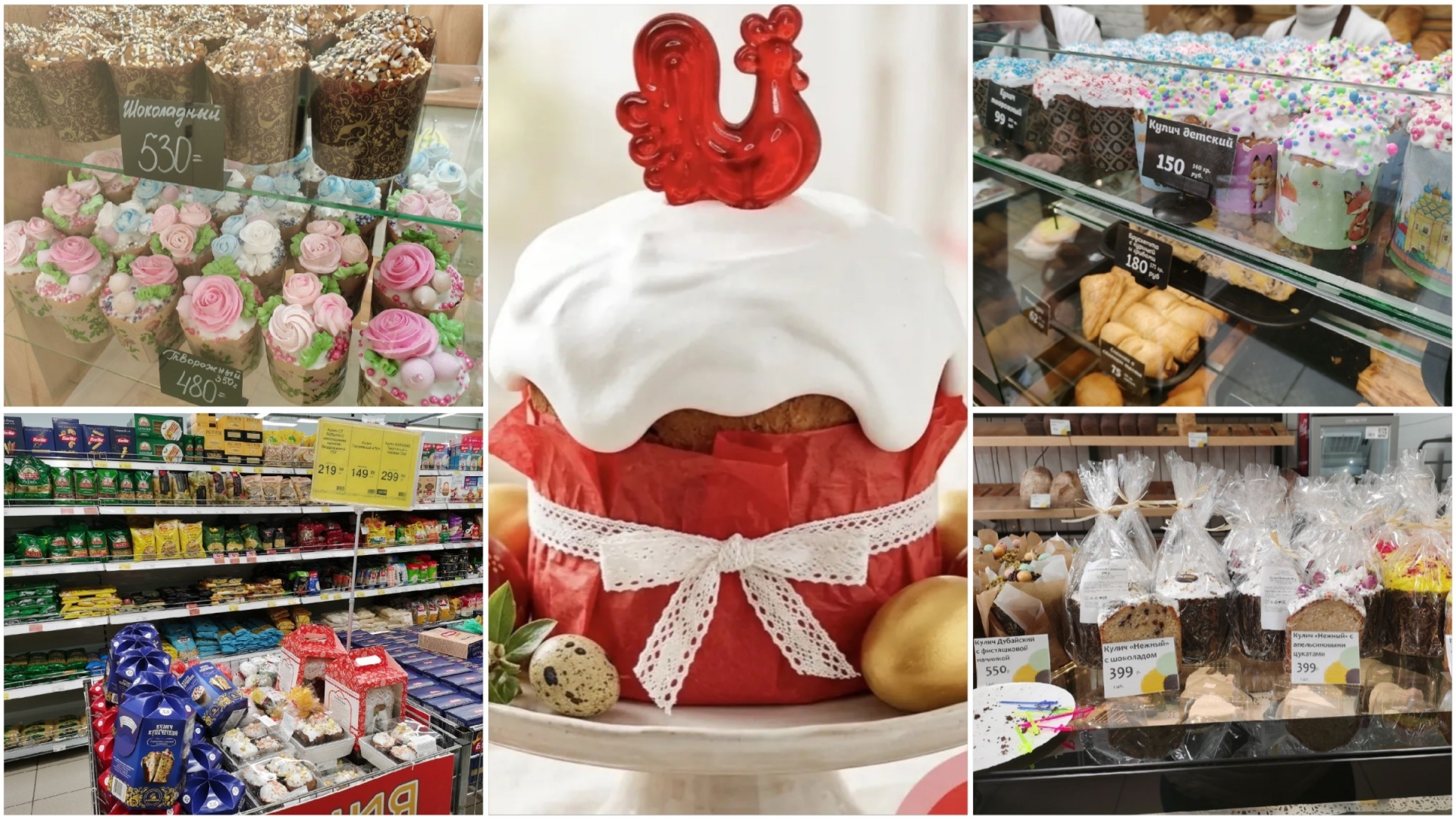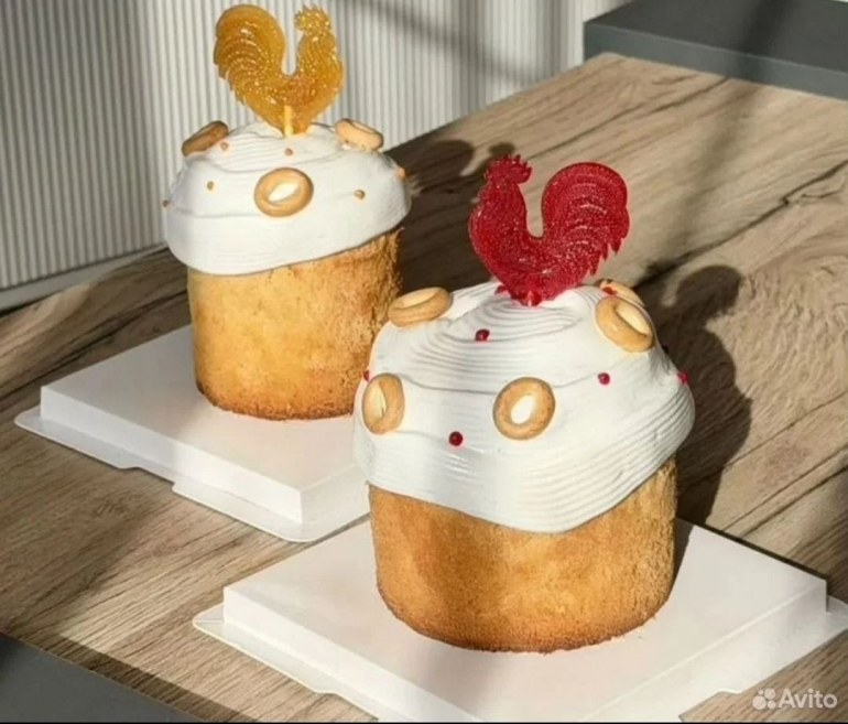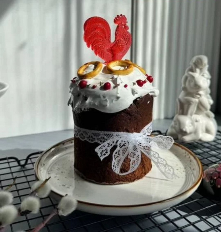 - Икра и петушки: Главная фишка сезона — куличи с белой шапкой, украшенные посыпкой из красной фруктовой икры. А обязательным аксессуаром стал красный петушок на палочке из изомальта.