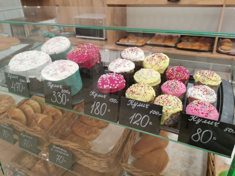- «Крендель»: Радует вариативностью веса. Маленький кулич (50 г) обойдется в 80 руб., а для семейного чаепития подойдут творожные (480 руб.) или шоколадные (530 руб.) варианты.