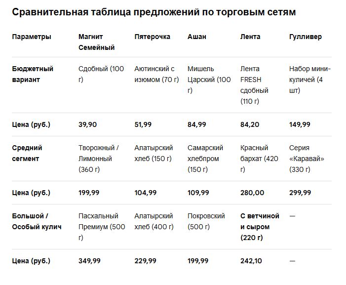 - Масс-маркет: В дискаунтерах вроде «Победы» маленькое изделие (100 г) стоит 50–60 руб. Классический кулич (300 г) в сетях можно найти за 99,99 руб.