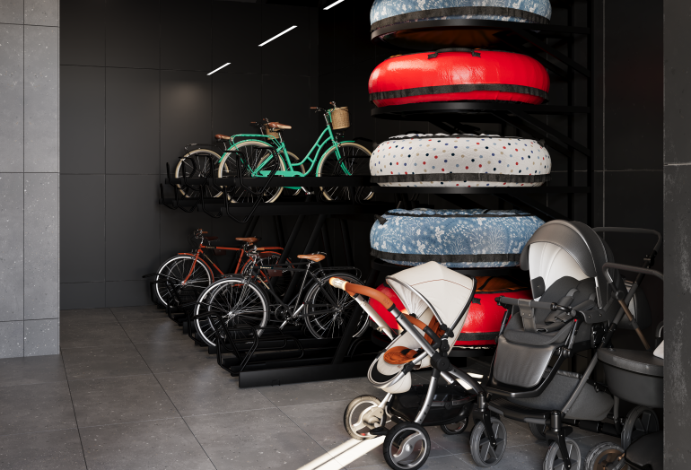 В каждой секции оборудованы вместительные колясочные на первом этаже, где можно оставить не только коляски, но и весь прогулочный инвентарь, велосипеды и самокаты. С заботой о чистоте дома и комфорте питомцев предусмотрены специальные лапомойки.