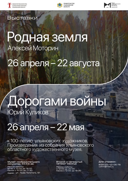 Выставки, посвященные 100-летию известных ульяновских художников: «Родная земля» народного художника России, фронтовика Алексея Моторина и «Дорогами войны» художника, графика, поэта, фронтовика Юрия Куликова.