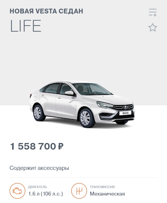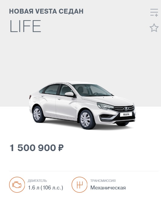Новую «Весту» седан в комплектации Life «Авторай» предлагает за 1 500 900 рублей – в соответствии с РРЦ. На сайте «Симбирск-Лада» та же модель продается за 1 558 700 рублей.