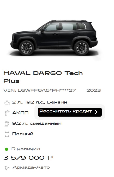 «Армада-Авто» продает модель в комплектации Tech Plus с двухлитровым движком и полным приводом за 3 579 000 рублей. Производитель оценил авто в 3 549 000 рублей.