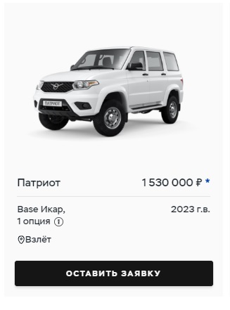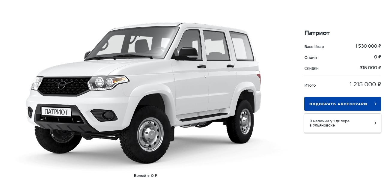 Официальный дилер в Ульяновске «Взлет» предлагает «Патриот» в базовой комплектации за 1 530 000 рублей. Завод предлагает модель за ту же цену, но со скидкой в 315 000 рублей.