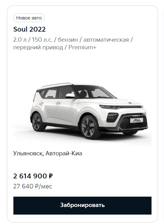 Kia Soul 2022 года выпуска в комплектации Premium+ продается за 2 614 900 рублей при минимальной цене производителя в 2 604 900 рублей. Модель, к слову, вошла в число наиболее подешевевших с августа к сентябрю (-12%), приводит данные со ссылкой на исследование Авто.ру портал banki.ru.