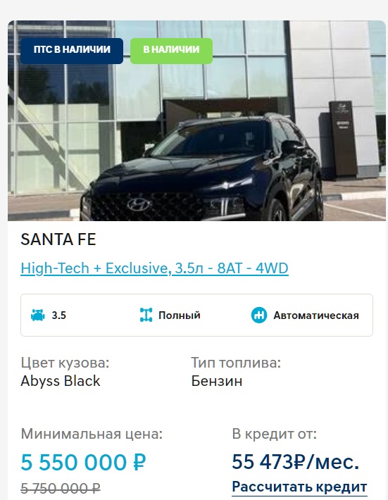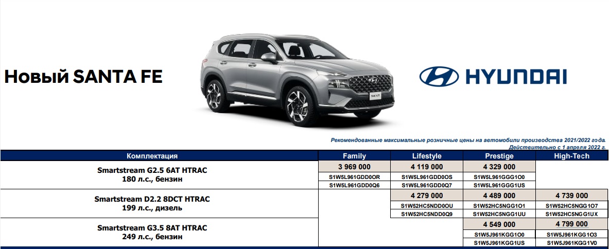 Hyundai Santa Fe есть у дилера в наличии: полноприводный Santa Fe в комплектации High-Tech с пакетом Exclusive продают за 5 750 000 рублей. При этом согласно прайсу производителя, модель в аналогичной комплектации стоит 4 799 000 рублей, пакет Exclusive – 70 000 рублей. Итого, цена производителя: 4 869 000 рублей.
