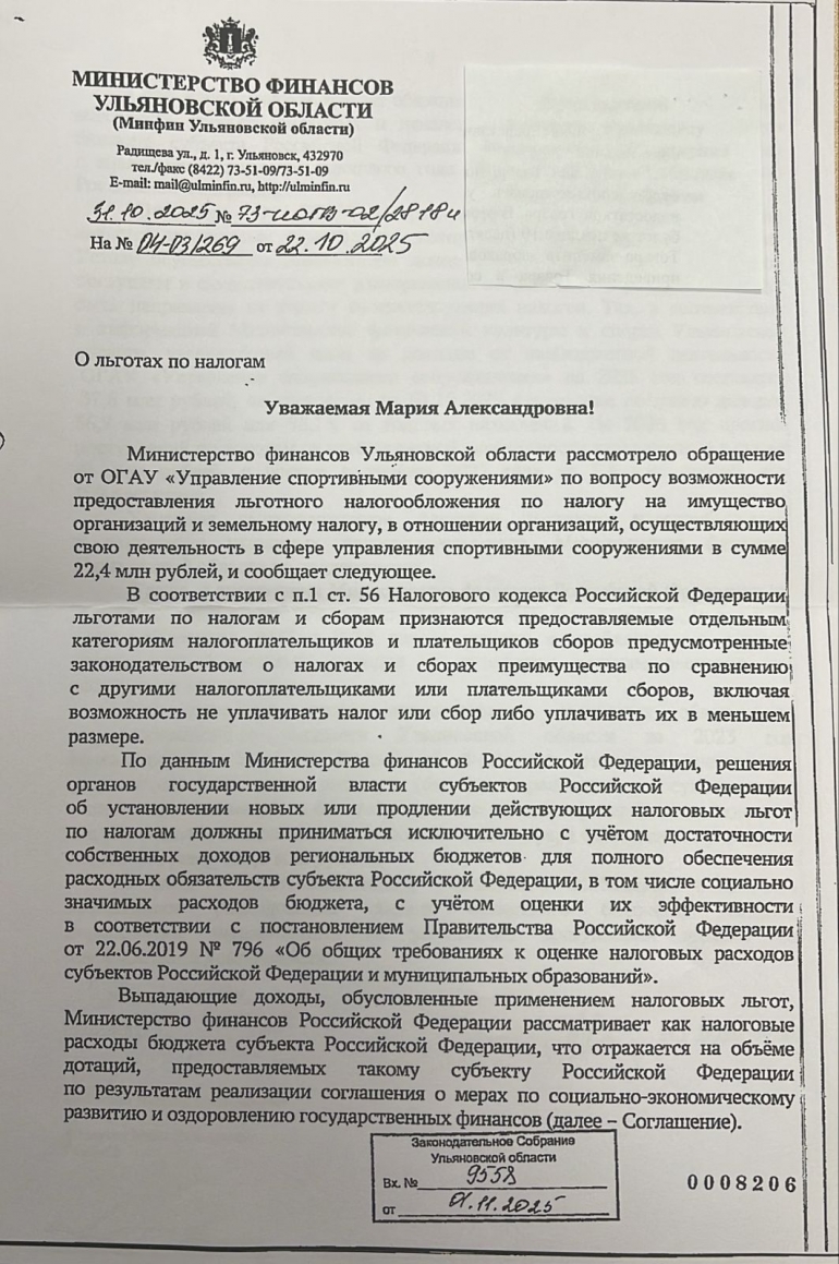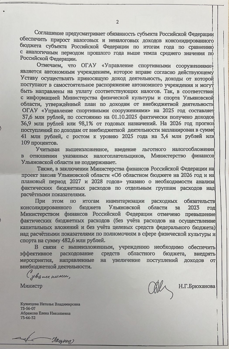 — В соответствии с информацией Министерства физической культуры и спорта Ульяновской области, утвержденный план по доходам от внебюджетной деятельности УСС на 2025 год составляет 37,6 млн рублей. По состоянию на 01.10.2025 фактически получено доходов 36,9 млн руб. или 98,1% от годовых назначений. На 2026 год прогноз поступлений по доходам от внебюджетной деятельности запланирован в сумме 41 млн рублей, с ростом к уровню 2025 года на 3,4 млн рублей или 109%. Учитывая вышеизложенное, учреждению необходимо обеспечить эффективное расходование средств и внедрять мероприятия, направленные на увеличение доходов, — говорится в документе, подписанном Натальей Брюхановой.