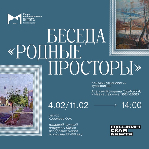 В рамках празднования 80-летия со дня основания Ульяновской области посетители смогут принять участие в беседе и медиапрограмме «Родные просторы». Участники узнают о жизни и творчестве заслуженных художников РСФСР ульяновцев Алексея Моторина и Ивана Лежнина.