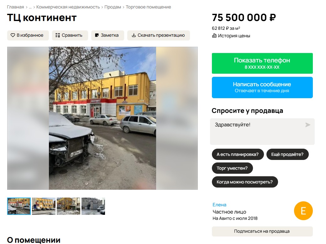 На платформе «Авито» появилось объявление о продаже двухэтажного торгового центра «Континент» в Ленинском районе за 75,5 млн рублей (62,8 тыс. рублей за «квадрат»).