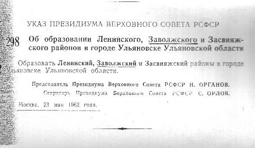 Указом Президиума Верховного Совета РСФСР от 22.11.1958 года Ленинский район г. Ульяновска был упразднен.