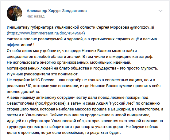 - От себя лишь могу добавить, что среди «Ночных Волков» можно найти специалистов в любой области знаний. В том числе и в медицине катастроф. Не использовать энергию организованных, мобильных, идейный, мотивированных людей на благо общества и государства - это просто глупость. И умные руководители это понимают, - написал Залдастанов на своей странице в соцсети.