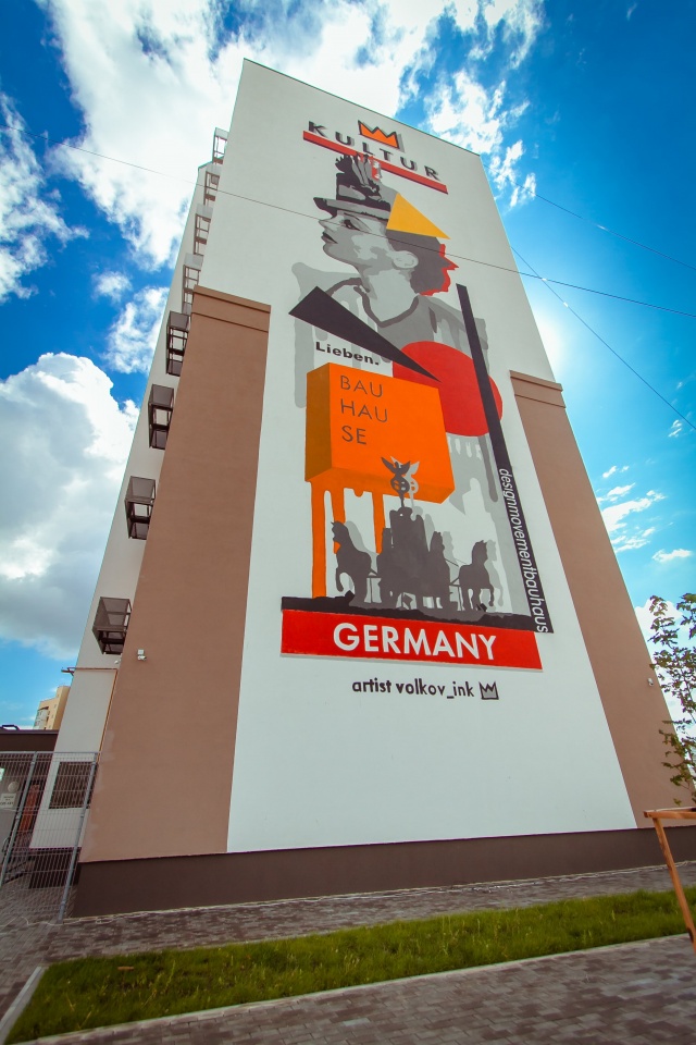 Дом на Юго-Западной, 9 в квартале «Европа» на 161 квартиру хорошо заметен издалека. На его стене нарисован огромный мурал - ульяновский художник Александр Волков создал картину высотой в девять этажей. В ее центре – монохромный образ женщины 20-30-х годов прошлого века, соединённый с фигурами в стиле баухауса. Это направление зародилось в те же годы в Германии и определило внешний облик современной архитектуры. Также на фасаде изображена часть Бранденбургских ворот, которые ещё больше погружают в немецкую культуру.