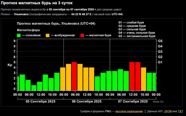 К 5 часам утра начнется слабая магнитная буря класса G1, которая завершится в районе 7 часов. Однако вплоть до полудня магнитное поле будет возмущенным.
