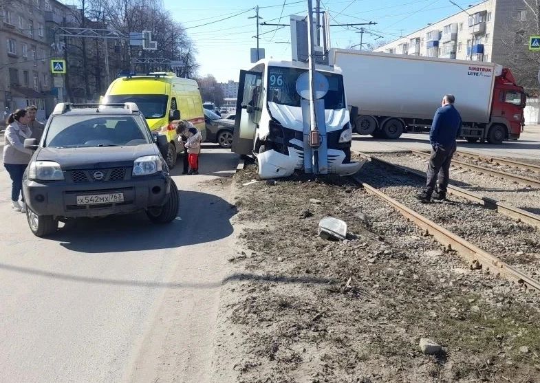 Сегодня днем, 31 марта, в Засвияжском районе Ульяновска маршрутка №96 столкнулась с автомобилем, а потом врезалась в столб возле рельсов. ДТП произошло на перекрестке улиц Рябикова и Стасова.