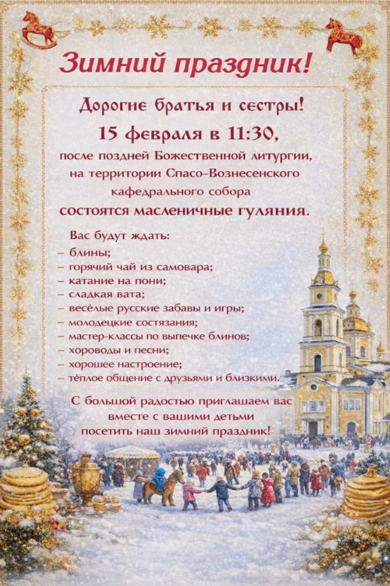 Спасо-Вознесенский кафедральный собор в Ульяновске приглашает детей и взрослых на масленичные гуляния. Зимний праздник состоится 15 февраля в 11:30 после поздней Божественной литургии.