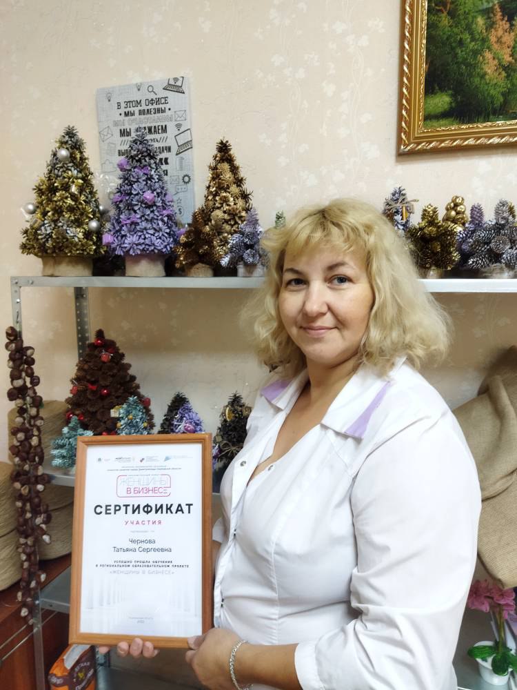 Благодаря соцконтракту, производство сувенирной продукции не просто расширилось, потребность в сувенирах оказалась высока. Помочь Князькиной решила землячка - 45-летняя Татьяна Чернова, которой с детства нравилось шить и вязать. По совету приятельницы женщина тоже заключила соглашение и получила 316 тысяч рублей на развитие своего дела. Татьяна купила специальные ножи, ножницы, пробойники, светильники и другое оборудование, а также расходные материалы для изготовления сувенирной продукции - картин и панно из даров природы, изделий из джута и других.