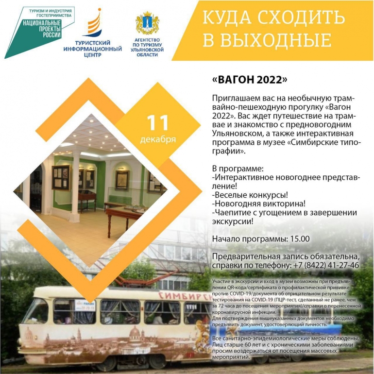 Приглашаем вас на необычную трамвайно-пешеходную прогулку «Вагон 2022». Вас ждет путешествие на трамвае и знакомство с предновогодним Ульяновском, а также интерактивная программа в музее «Симбирские типографии».