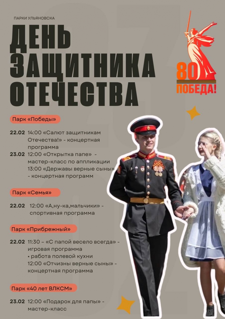 - 22 февраля, 14:00 — концерт «Салют защитникам Отечества!»;