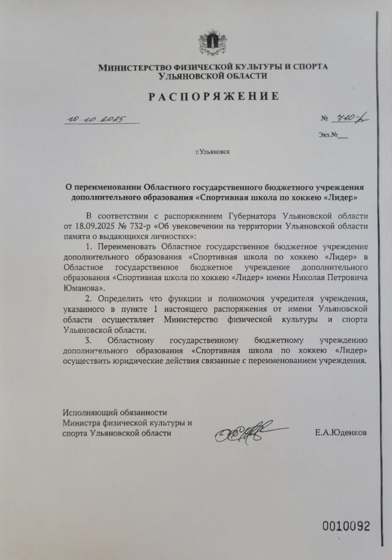 Спортивная хоккейная школа «Лидер» будет носить имя Николая Петровича Юманова. Соответствующее распоряжение было подписано 10 октября этого года. На данный момент проходят все необходимые юридические процедуры, которые завершатся в течение ближайшей недели. Директор спортивной школы по хоккею «Лидер» Николай Петрович Юманов героически погиб в ходе проведения специальной военной операции, посмертно награждён Орденом Мужества.
