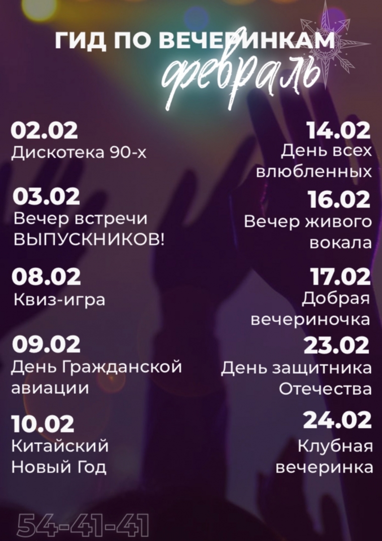 Дополнительная информация и бронирование столов по телефону: 54-41-41.