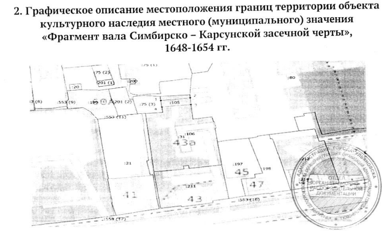 На сайте администрации Ульяновска опубликовано постановление об утверждении границ территории объекта культурного наследия (ОКН) местного значения «Фрагмент вала Симбирско – Карсунской засечной черты, 1648-1654 годов», расположенного по улице Льва Толстого, 43а.