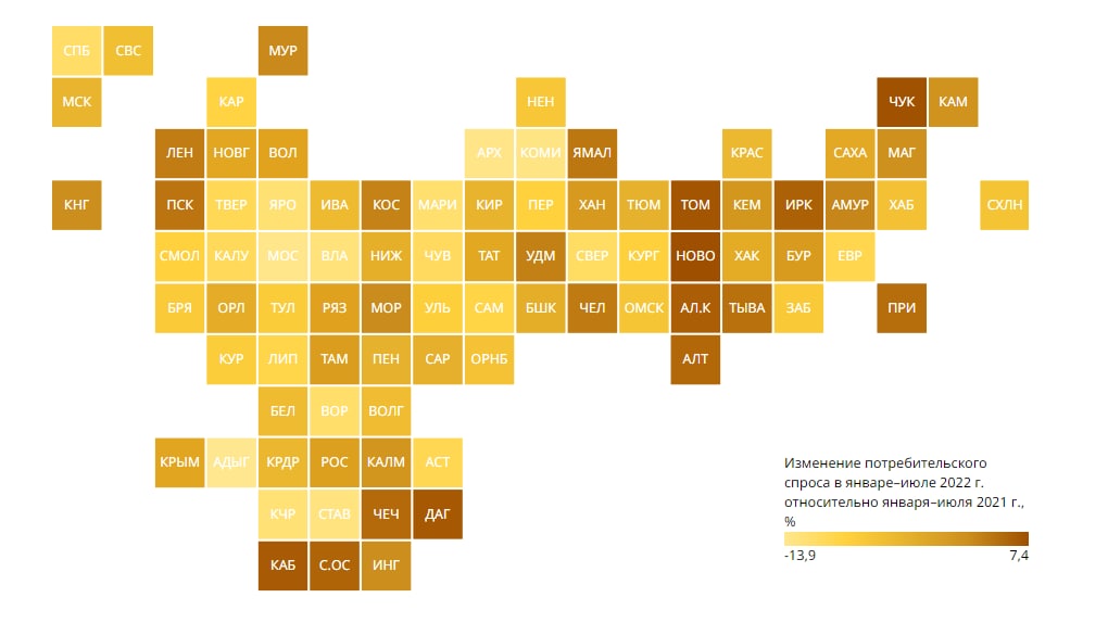 Рост потребительского спроса наблюдается в 26 регионах России в 2022 году, при этом лидерами рейтинга оказались Новосибирская область, Чукотка и Томская область, в конце списка расположились Адыгея, Московская и Архангельская области.