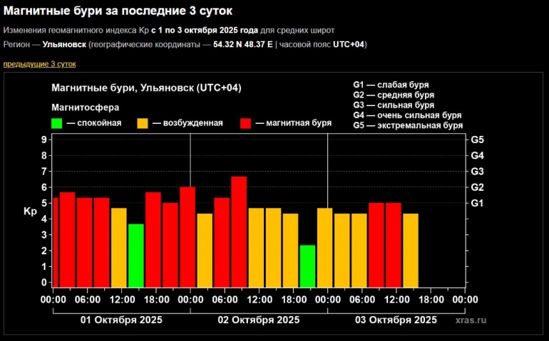 При этом геомагнитное поле планеты все еще штормит. Продолжительная и мощная магнитная аномалия, стартовавшая утром 30 сентября, переросла в исключительное по своей продолжительности и интенсивности явление. Уже больше трех суток геомагнитное поле пребывает в активном состоянии, не опускаясь ниже уровня G1 и эпизодически достигая отметки G3 (сильная магнитная буря).