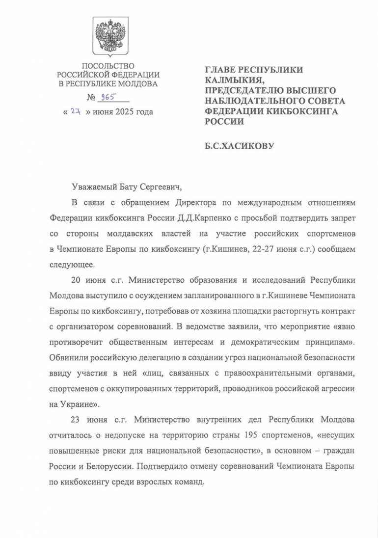 Чемпионат Европы по кикбоксингу должен был пройти с 22 по 27 июня. За день до начала турнира Федерация кикбоксинга получила официальное письмо от посольства РФ в Республике Молдова об отмене соревнований и недопуске российских спортсменов: