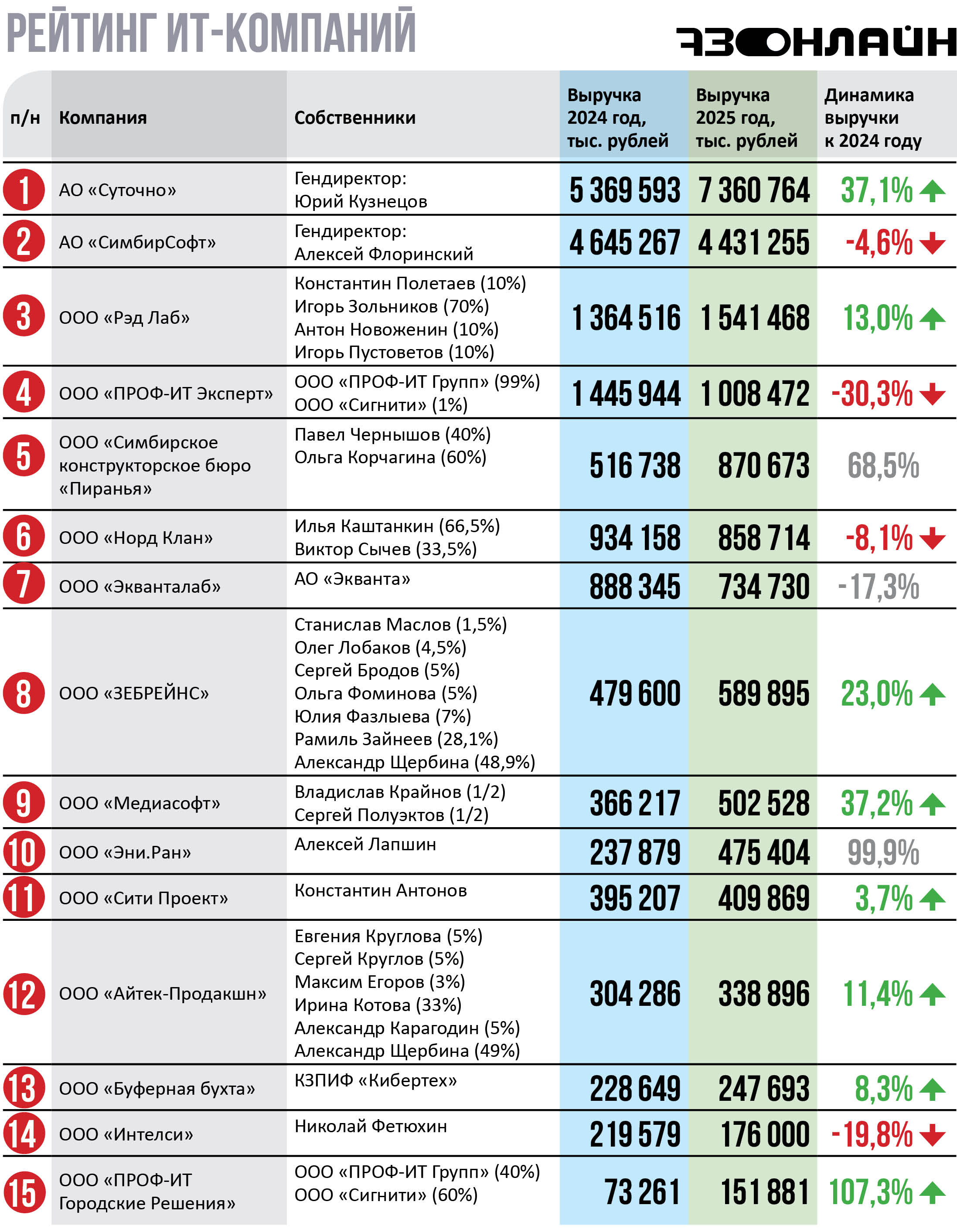 На одну строчку опустился «ПРОФ-ИТ Эксперт», потеряв в 2025-м 30% выручки. «Зебрейнс» сохранил за собой восьмое место, а «МедиаСофт» поднялся с десятой на девятую позицию. Ниже в рейтинге стал один из «Айтеков» Александра Щербины, разместившись на двенадцатой строке.