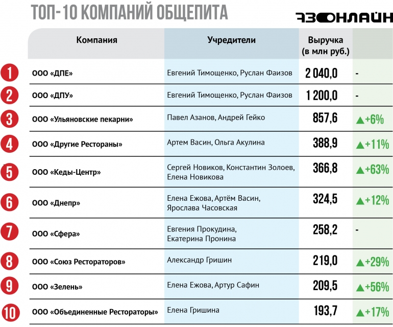 Шестую строчку заняло ООО «Днепр» (324,5 млн руб.), связанное с ресторатором Еленой Ежовой. Следом идет ООО «Сфера» (258,2 млн руб.). В десятке лучших две компании Александра Гришина: на восьмом месте ООО «Союз Рестораторов» (219 млн руб., рост сразу на 29%). а ООО «Объединенные Рестораторы» (193,7 млн руб.) — на десятом. Между ними на девятой строчке ООО «Зелень» Елены Ежовой и Артура Сафина. Выручка составила 209,5 млн руб. (+56%), что явно говорит о растущей популярности сервисов по доставке здоровой еды и рационов в Ульяновске.