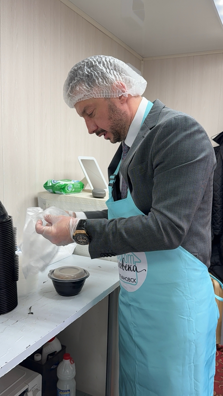 Картина у волонтерского пункта получилась кинематографичная. Из люксового авто Артур Валерьевич вышел при полном параде: строгий костюм, галстук, статусные часы и остроносые туфли, чья фактура недвусмысленно намекала на крокодиловую кожу. Чтобы не смущать подопечных блеском аксессуаров, Котельников делегировал хранение своего пальто руководителю проекта Айрату Сафину и облачился в рабочий «дресс-код»: фартук, перчатки и чепчик. Кстати, в этой экипировке бизнесмен выглядел не менее гармонично, чем в привычном брендовом обмундировании.