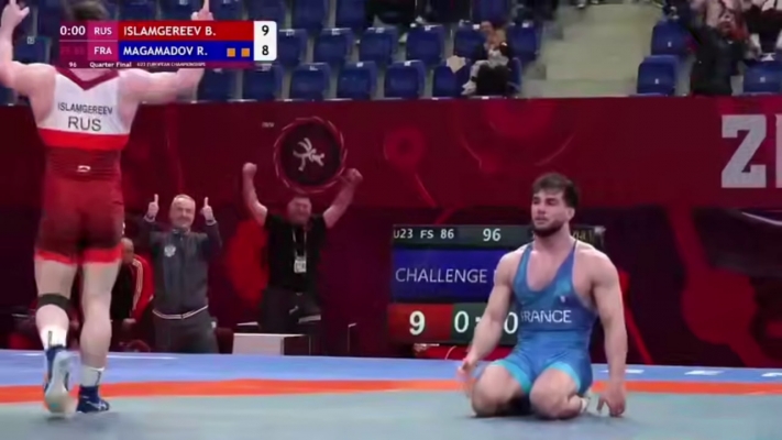 В четвертьфинальном поединке, состоявшемся во вторник, оппонентом Исламгереева стал Рахим Магамадов, этнический чеченец, выступающий за сборную Франции. На последних секундах схватки, когда россиянин проигрывал со счетом 5:8 дважды становившемуся чемпионом мира среди юниоров (до 20 лет) Магамадову, Исламгереев совершил головокружительный маневр: он подпрыгнул, обхватил противника сзади, перевернул его и выполнил бросок. Эта блестящая комбинация принесла Исламгерееву победу со счетом 10:8.