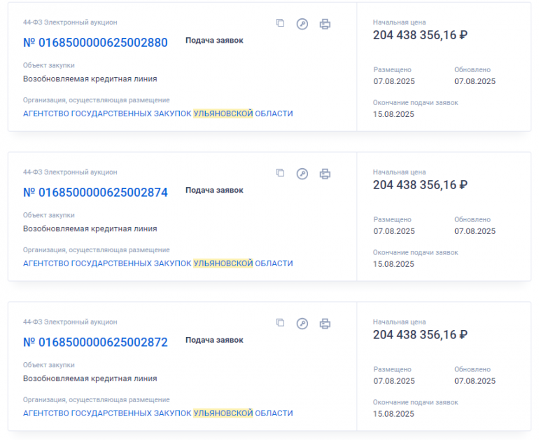 Информация о проведении серии аукционов опубликована в ЕИС «Закупки».