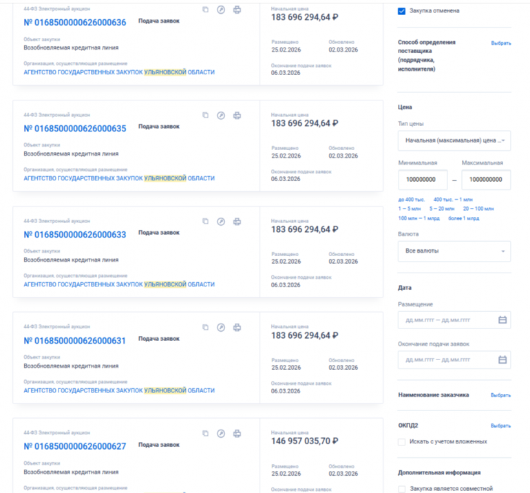 Информация о проведении пяти аукционов опубликована в ЕИС «Закупки».