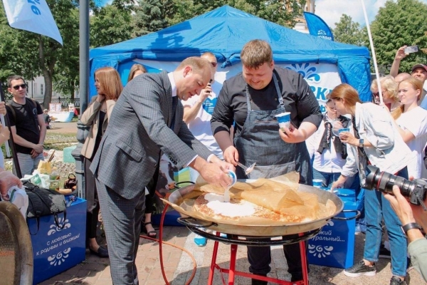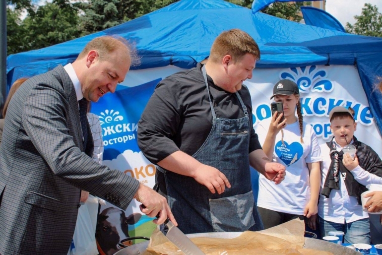 Министр АПК региона Михаил Семенкин под руководством шеф-повара одного из ресторанов города Алексея Бамбурова испёк гигантский сырник. Мероприятие также посетил губернатор Ульяновской области Алексей Русских.