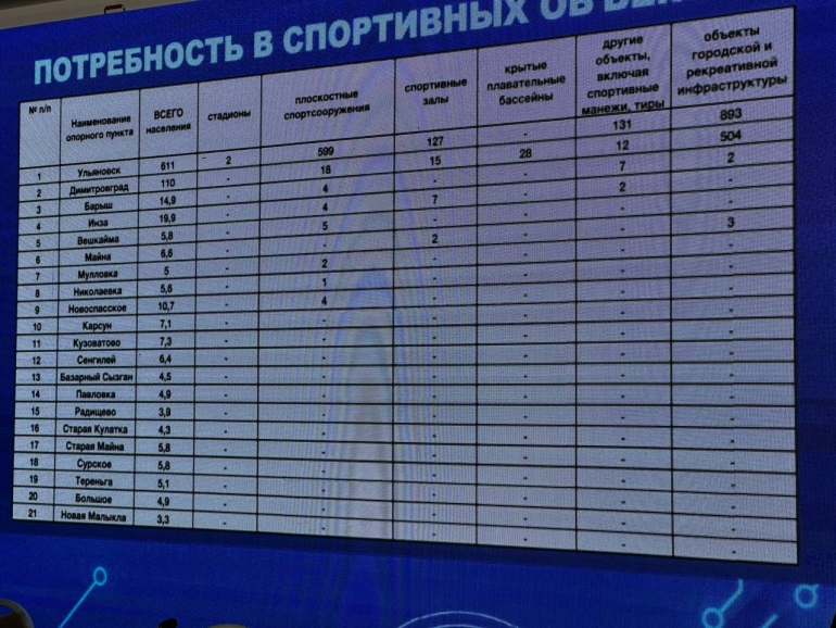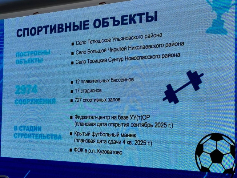 - Самый крупный объект, который сейчас находится на стадии строительства — крытый футбольный манеж в Ульяновске, сдача объекта запланирована на четвёртый квартал 2025 года.