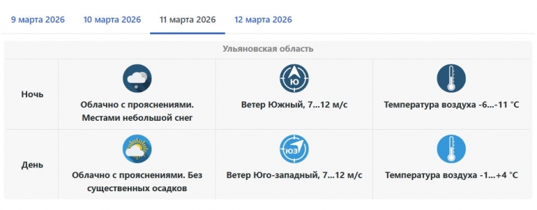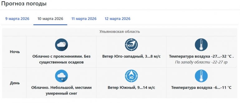 При этом в среду морозы уже пойдут на спад. В ночь на 11 марта ожидается от 6 до 11 градусов мороза. Днем воздух прогреется уже до +4 градусов.