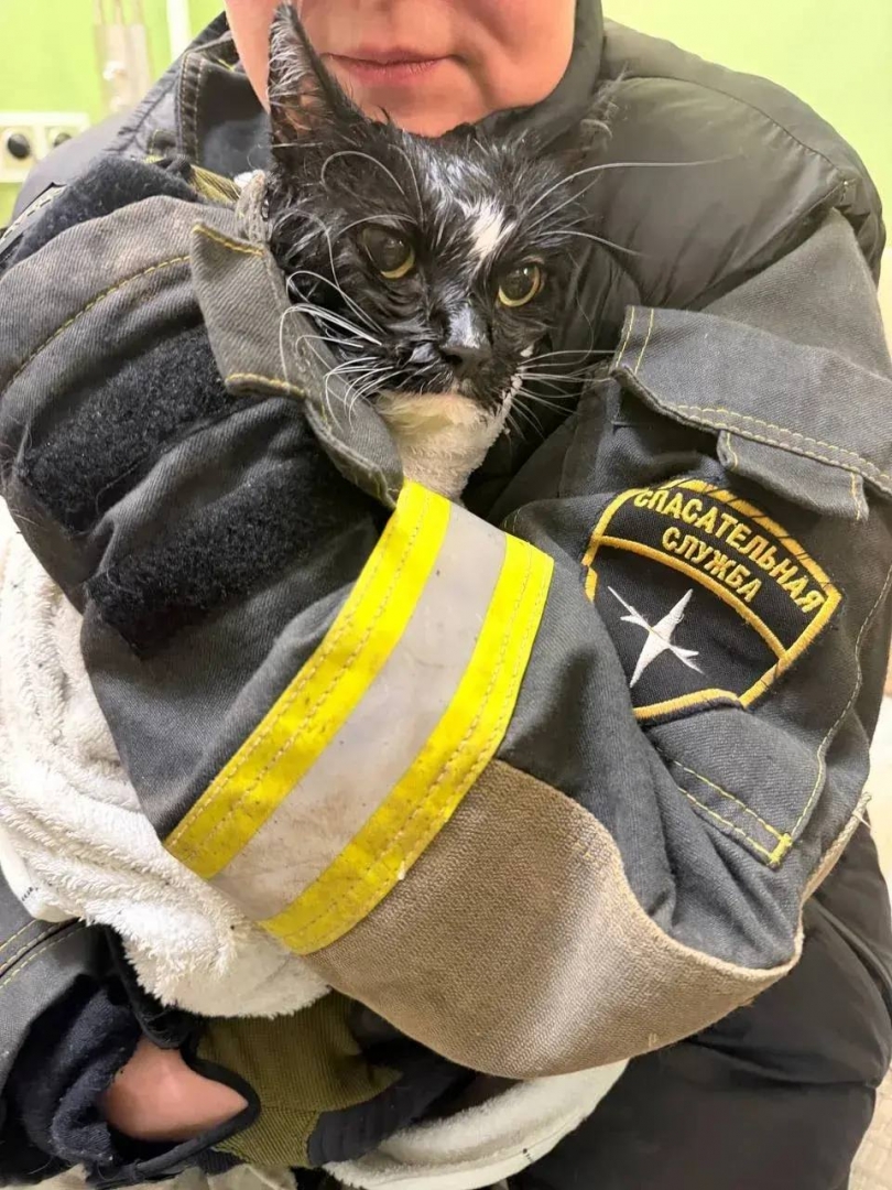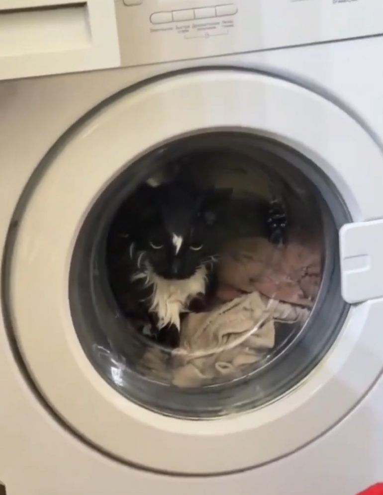 Это частично сработало: уровень воды в машинке сильно упал, кот смог лучше дышать. Прибыв на место, спасатели с усилием открыли дверь машинки. Испуганного любимца вызволили.