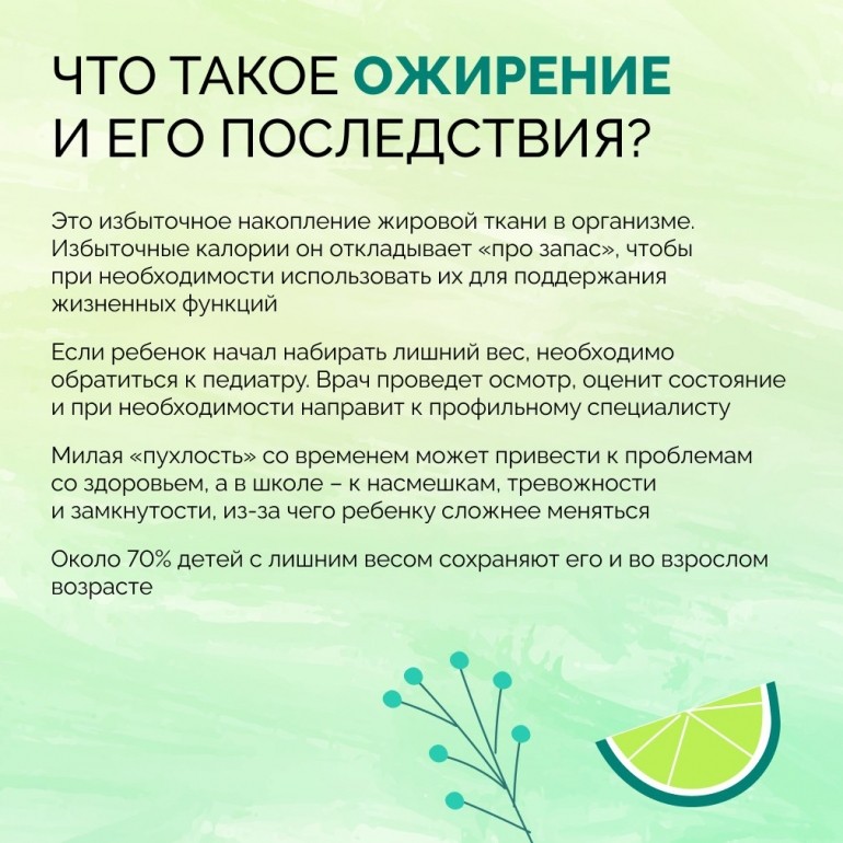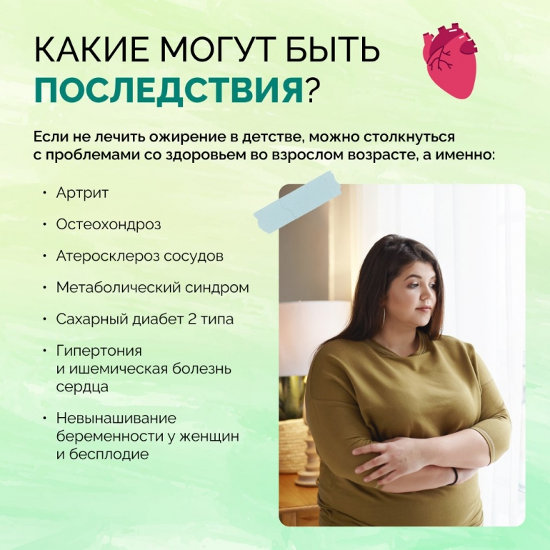 Также врач сообщила о последствиях: если не лечить ожирение в детстве, можно столкнуться с проблемами со здоровьем во взрослом возрасте. Это артрит, остеохондроз, атеросклероз сосудов, метаболический синдром, сахарный диабет 2 типа, гипертония, ишемическая болезнь сердца и бесплодие.