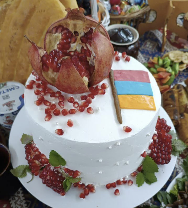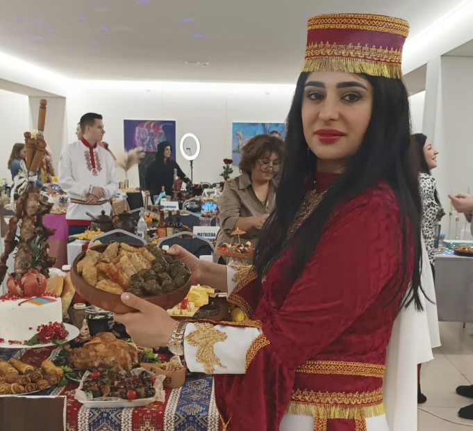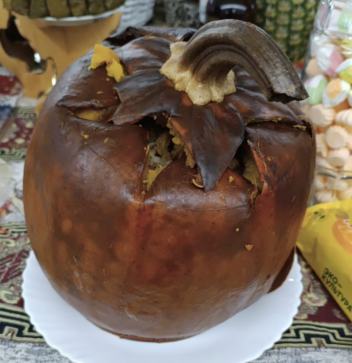 Первыми в ресторан приехали помощницы Оксанны Аванесян — ее мама и подруга Ануш. Готовили на протяжении двух недель — помогали все близкие, включая четверых детей Оксанны. Сама она выглядела просто великолепно в национальном костюме армянской невесты. На суд жюри она представила фирменный плов в тыкве (в духовке он томился час) и бисквитный торт с армянским флагом.