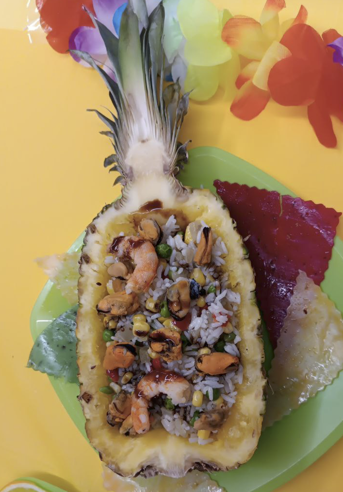 — Хотелось окунуться в летний день, добавить ярких красок. Я сделала авторский салат из креветок, риса, мидий, зеленого горошка, сладкой кукурузы, болгарского перца, бальзамического соуса и выложила его в ананас, — показала свое творение Наталья.