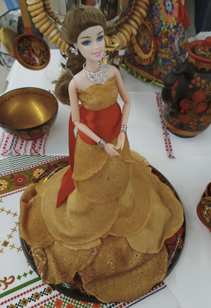 Марина Лазарева выбрала блинную тематику. Сама она предстала в образе богини Солнца. А для жюри приготовила блины с мясом, длинные роллы из них и разодетую в блинный костюм «подружку».