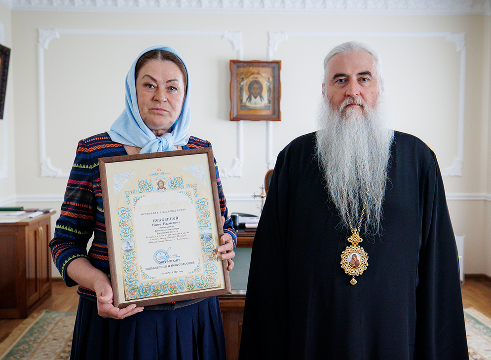 Владыка вручил ей Архиерейскую грамоту за активный вклад в дело строительства храма в честь иконы Божией Матери «Неупиваемая Чаша» и поблагодарил за помощь приходу.