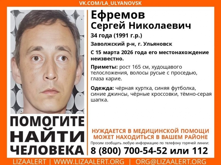 В Заволжском районе Ульяновска 15 марта пропал 34-летний местный житель Сергей Ефремов.