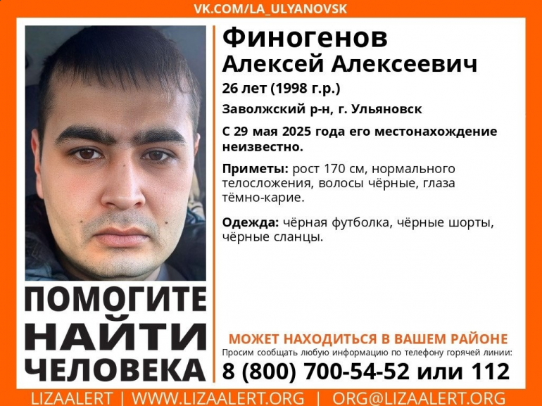 В Заволжском районе Ульяновска 29 мая пропал 26-летний местный житель Алексей Финогенов.