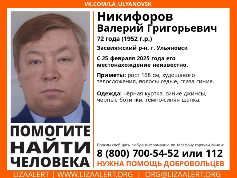Вчера, 25 февраля, в Засвияжском районе Ульяновска пропал 72-летний местный житель Валерий Никифоров.