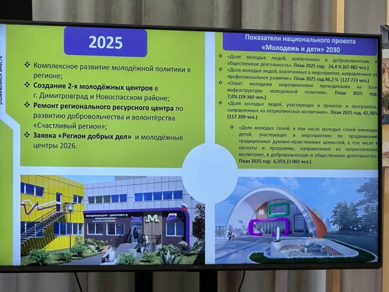 По итогам программы комплексного развития молодёжной политики в регионах Российской Федерации «Регион для молодых» Ульяновская область стала победителем федеральной субсидии на сумму 119 млн рублей. В 2025 году откроют два новых молодёжных центра в Димитровграде и р.п. Новоспасское. Министерство ставит для себя задачу — открытие молодежных центров во всех муниципалитетах.